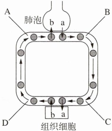 (2)组织细胞周围的毛细血管,一端连接[D]______,另一端连接[C]______。D内流动的是______血,C内流动的是______血。在组织内发生气体交换的过程是a由______扩散到______中,b由______扩散到______中。