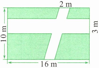 5. 下图是一块长方形草地,长16米,宽10米。草地中间有两条路,一条路的形状是长方形,另一条路的形状是平行四边形。草坪(涂色部分)的面积是多少平方米?