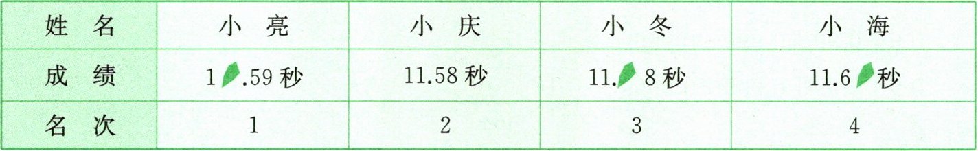 答:小亮成绩为10.59秒,小庆为11.58秒,小冬为11.68秒,小海为11.69秒。