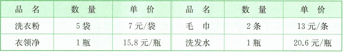 |洗衣粉|5袋|7元/袋|毛 巾|2条|13元/条|