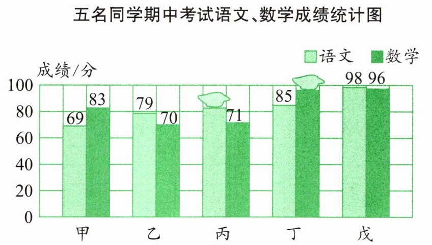 (2)这五名同学的数学平均成绩是83分,丁同学的数学成绩是( )。