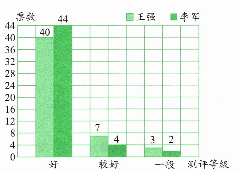 3. 某班竞选班长,为了在最终候选人王强和李军中选出班长,进行了演讲与民主测评两项活动。A、B、C、D、E五位老师作为评委对王强、李军的演讲情况打分,该班50名同学分别对王强和李军按“好”“较好”“一般”三个等级进行民主测评,统计结果如下面的图表。计分规则: