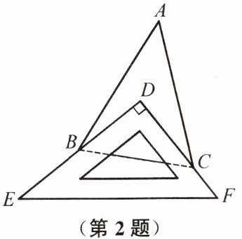 2. 如图,将一块直角三角板 $DEF$ 放置在锐角三角形 $ABC$ 上,使得该三角板的两条直角边 $DE$,$DF$ 恰好分别经过点 $B$,$C$,若$\angle A = 45^{\circ}$,则$\angle ABD+\angle ACD$的值为(