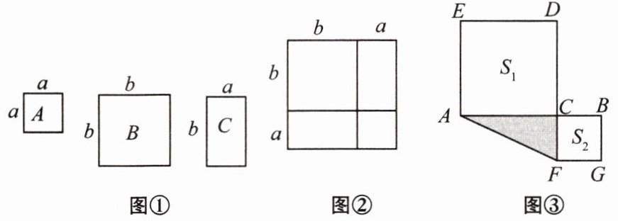 26. 数学活动课上,张老师用图①中的$1张边长为a的正方形A$纸片、$1张边长为b的正方形B纸片和2张宽和长分别为a与b的长方形C$纸片,拼成了如图②中的大正方形纸片。观察图形并解答下列问题。