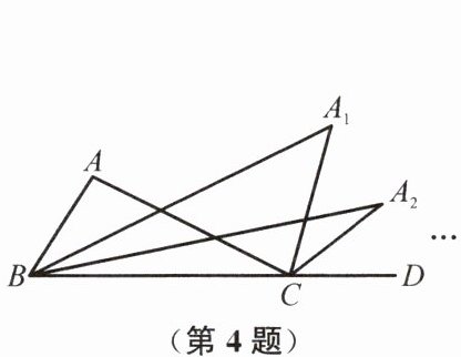 4. 如图,在$\triangle ABC$中,$\angle A = 96^{\circ}$,延长$BC至点D$,$\angle ABC与\angle ACD的平分线相交于点A_{1}$,$\angle A_{1}BC与\angle A_{1}CD的平分线相交于点A_{2}$,以此类推,$\angle A_{4}BC与\angle A_{4}CD的平分线相交于点A_{5}$,$\angle A_{5}$的度数为(