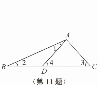 11. 如图,在△ABC中,D为BC上一点,∠1= ∠2,∠3= ∠4,∠BAC= 105°,则∠DAC的度数为(