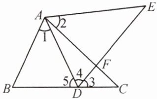 5. 如图,点$E在\triangle ABC$的外部,点$D在边BC$上,$DE交AC于点F$,$\angle1= \angle2= \angle3$,$AC = AE$.