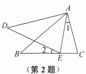 2. 如图,在△ABC和△ADE中,点E在边BC上,AD= AB,AE= AC,DE= BC,若∠1= 25°,则∠2的度数为