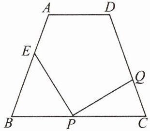 5. 如图,在梯形 ABCD 中$, AB = DC = 12 cm , BC = 15 cm , \angle B = \angle C , E $为边 AB 上一点,且 AE = 5 cm 。点 P 在线段 BC 上以 3 cm/s 的速度由点 B 向点 C 运动,同时点 Q 在线段 CD 上由点 C 向点 D 运动。设点 P 运动的时间为 t s ,请回答下面的问题: