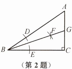2. 如图,在Rt△ABC中,∠C= 90°,利用尺规在BC,BA上分别截取BE,BD,使BE= BD;分别以点D,E为圆心,大于$\frac{1}{2}DE$的长为半径作弧,两弧在∠CBA内交于点F;作射线BF交AC于点G.若CG= 2,则点G到直线AB的距离为(