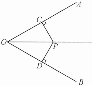 用符号表示:如图,∵ $ PC \perp OA $ 于点 $ C $, $ PD \perp OB $ 于点 $ D $, $ PC = PD $,