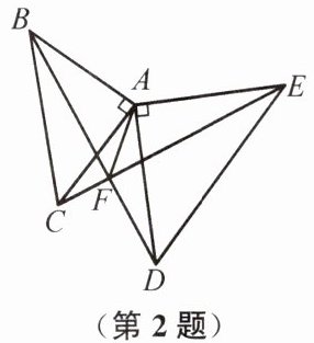 2. 如图,已知在 $ \triangle ABC $ 和 $ \triangle ADE $ 中, $ AB = AC $, $ AD = AE $, $ \angle BAC = \angle DAE = 90^{\circ} $, $ BD $, $ CE $ 交于点 $ F $, 连接 $ AF $. 下列结论: ① $ BD = CE $; ② $ BF \perp CF $; ③ $ AF $ 平分 $ \angle BAD $; ④ $ \angle AFE = 45^{\circ} $. 其中正确的是