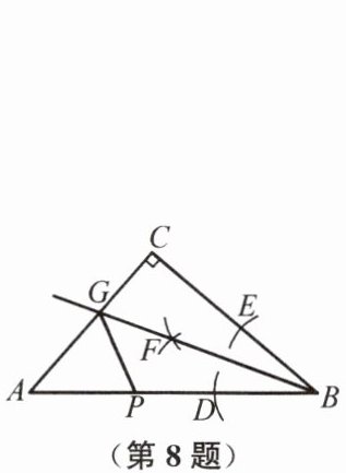 8. 如图,在$Rt\triangle ABC$ 中,$\angle C = 90^{\circ}$,按以下步骤作图:① 利用尺规在 $BC$,$BA$ 上分别截取 $BE$,$BD$,使 $BE = BD$;② 分别以点 $D$,$E$ 为圆心,大于$\frac{1}{2}DE$ 的长为半径作弧,两弧在$\angle CBA$ 内交于点 $F$;③ 作射线 $BF$ 交 $AC$ 于点 $G$。若$\triangle BCG$ 的面积为 $4$,$BC = 4$,$P$ 为 $AB$ 上一动点,则 $GP$ 的最小值为(