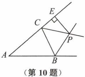 10. 如图,$\triangle ABC$ 的两条外角平分线 $BP$,$CP$ 相交于点 $P$,$PE\perp AC$ 交 $AC$ 的延长线于点 $E$。若$\triangle ABC$ 的周长为 $11$,$PE = 2$,$\triangle BPC$ 的面积为 $2$,则$\triangle ABC$ 的面积为(
