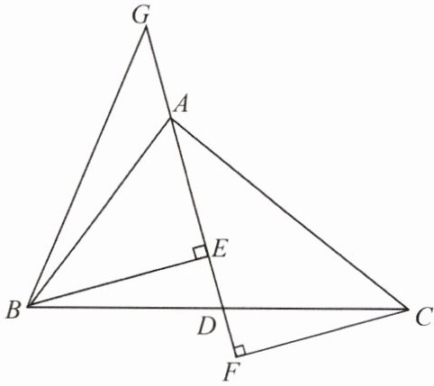 15. 如图,$AD$ 是$\triangle ABC$ 的中线,$BE\perp AD$,垂足为 $E$。$CF\perp AD$ 交 $AD$ 的延长线于点 $F$,$G$ 是 $DA$ 延长线上一点,连接 $BG$。