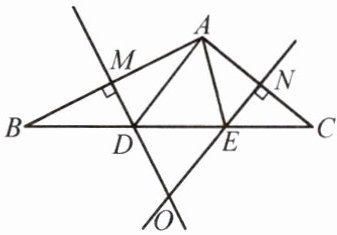 6. 如图,在$\triangle ABC$中,边$AB的垂直平分线OM与边AC的垂直平分线ON交于点O$,这两条垂直平分线分别交$BC于点D$,$E$。已知$\triangle ADE的周长为13\ cm$。
