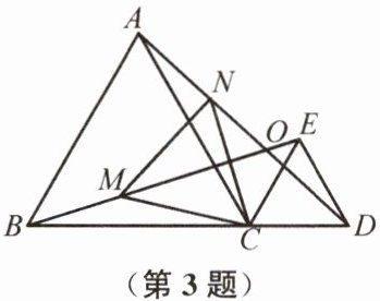 3. 如图,已知$\triangle ABC$ 和$\triangle ECD$ 都是等边三角形,且点 $B$,$C$,$D$ 在同一条直线上,连接 $BE$,与 $AD$ 相交于点 $O$. $M$,$N$ 分别是线段 $BE$,$AD$ 上的两点,且 $BM= \frac{1}{3}BE$,$AN= \frac{1}{3}AD$,则下列结论:① $BE = AD$;② $\triangle BCM\cong\triangle ACN$;③ $\angle BOD = 100^{\circ}$;④ $\triangle CNM$ 是等边三角形;⑤ $BC = ND$. 其中正确的结论是