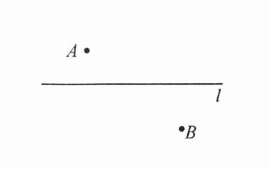 2. 如图,$ A $,$ B $ 在直线 $ l $ 异侧,在直线 $ l $ 上取一点 $ P $,使 $ PA + PB $ 的值最小。