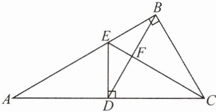 $\because ED \perp AC$, $\therefore \angle EDC = \angle ABC = 90^{\circ}$. 在$Rt\triangle ECB$和$Rt\triangle ECD$中, $\left\{\begin{array}{l} EC = EC, \\ BC = DC, \end{array}\right.$ $\therefore Rt\triangle ECB \cong Rt\triangle ECD(HL)$. $\therefore \angle ECB = \angle ECD$. 又$\because BC = DC$, $\therefore CF \perp BD$, $BF = DF$. $\therefore CE$垂直平分$BD$.