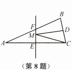 8. 如图,在 $ \triangle ABC $ 中,$ AB = AC $,$ BC = 4 $,$ \triangle ABC $ 的面积是 $ 16 $,$ AC $ 的垂直平分线 $ EF $ 分别交边 $ AC $,$ AB $ 于点 $ E $,$ F $,若 $ D $ 为边 $ BC $ 的中点,$ M $ 为线段 $ EF $ 上一动点,则 $ \triangle CDM $ 周长的最小值为(
