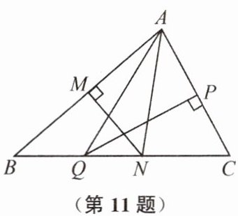 11. 如图,在 $ \triangle ABC $ 中,作边 $ AB $ 的垂直平分线 $ MN $,分别与边 $ AB $ 和边 $ BC $ 交于点 $ M $ 和点 $ N $,作边 $ AC $ 的垂直平分线 $ PQ $,分别与边 $ AC $ 和边 $ BC $ 交于点 $ P $ 和点 $ Q $,$ \triangle AQN $ 的周长为 $ 13 $,若 $ QN = 2 $,则 $ BC $ 的长为(