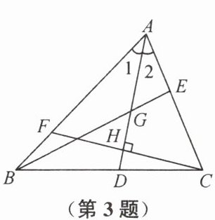 3. 如图,在△ABC中,∠1 = ∠2,G是AD的中点,延长BG交AC于点E,F为AB上一点,CF⊥AD交AD于点H.①AD是△ABE的角平分线;②BE是△ABD的边AD上的中线;③CH为△ACD的边AD上的高;④AH是△ACF的角平分线和高.其中判断正确的有