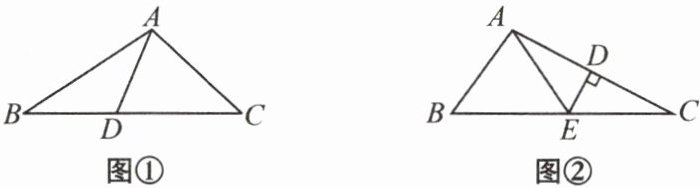 (1)如图②,在 $ \triangle ABC $ 中,$ \angle B = 2 \angle C $,线段 $ AC $ 的垂直平分线 $ ED $ 交 $ AC $ 于点 $ D $,交 $ BC $ 于点 $ E $. 求证:$ AE $ 是 $ \triangle ABC $ 的一条等腰分割线.