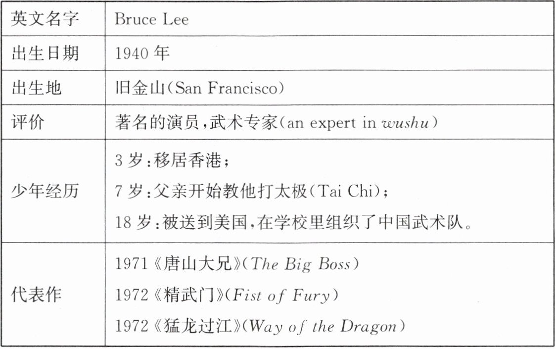 假如李小龙是你最喜欢的电影明星,下面表格中的内容是关于他的介绍。请你以“Bruce Lee”为题用英语写一篇介绍他的短文。