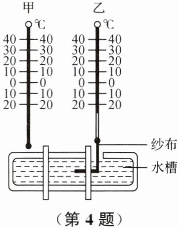 4. 生活中有一种能反映空气中水蒸气含量的装置叫干湿泡湿度计。湿度大表明空气中水蒸气含量高。如图所示是由两个相同的温度计并列制成的,其中一个温度计被湿布包起来了,湿布放在装有水的水槽中。两个温度计的读数不一样,湿泡温度计的读数较小,这是由于干湿布中的水