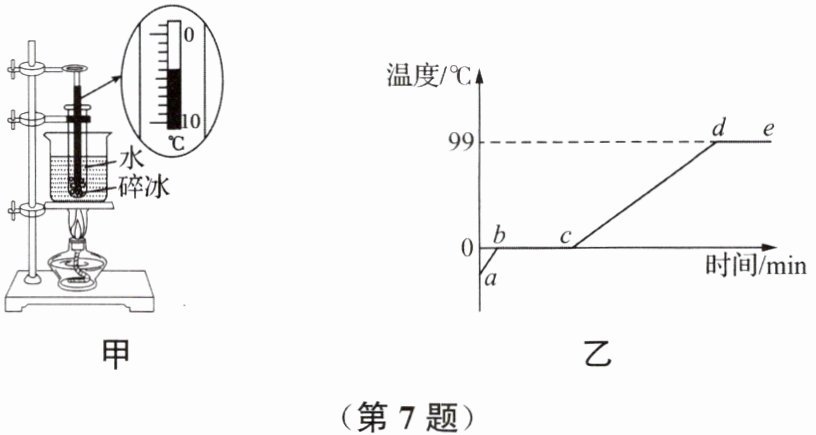 7. 图甲中,试管中装有适量的碎冰,用酒精灯对烧杯中足量的水进行加热,用温度计测量不同时刻冰的温度值,冰的温度随时间变化的图像如图乙所示。