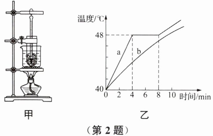 2. 小冰同学用如图甲所示装置“探究固体的熔化特点”,用温度计分别测量试管内a、b两种物质的温度,温度随时间变化的关系图像如图乙所示。实验中采用“水浴法”加热的目的是