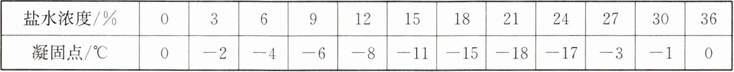 分析表格中数据可知,当盐水浓度增大时,其凝固点