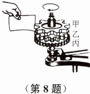 8. 老师在演示如图所示的齿轮拨动纸片的实验中,甲、乙、丙三种齿轮依次拨动纸片发出声音,下列说法正确的是(