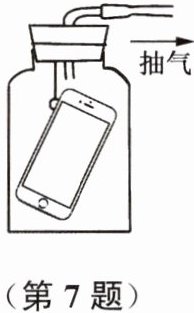 7. 如图所示,小丽等同学在探究声音传播的过程中,将一部手机放入厚壁玻璃瓶中,用橡皮塞密封瓶口,再不断向外抽气,同时拨打这部手机,让手机不停地发出“嘟……”的铃声。这时声音发生变化的是(