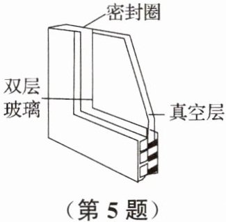 5. 同学们制作隔音房间模型,他们在房间内壁填充了吸音棉,还安装了一扇中空玻璃窗(如图所示是玻璃窗的剖面图),将一个正在发声的闹钟放在房间模型内,关上房间模型的门窗,听到闹钟的声音明显减弱。下列说法正确的是(