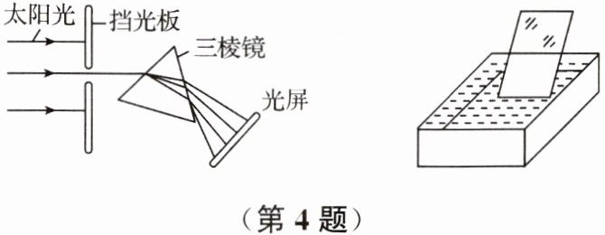 4. 如图所示,让一束太阳光通过挡光板的狭缝照射到三棱镜的一个侧面上,用光屏接收从三棱镜的另一侧出射的光线。