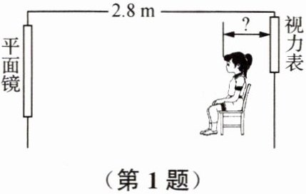 1. 如图所示,在检查视力时,视力表和平面镜挂在房间的两面墙上,被测者观察镜子里的像,此时视力表在平面镜中的像与被测者的眼睛相距5m,则被测者眼睛距离身后视力表的距离为