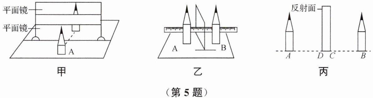 5. 在探究平面镜成像特点的实验中,我们一般选用玻璃板代替平面镜,这样既能看见物体的像,也能透过玻璃板看见另一侧的物体,便于确定物体像的位置,但在实验中,由于玻璃板前后两个面都能成像,并且玻璃板的厚度对研究成像规律也有影响,聪明的小明利用网上定制的两面小镜子(该平面镜的前表面为反射面)也完成了实验。小明的实验步骤如下。