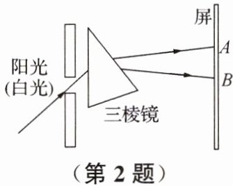 2. 如图所示,太阳光通过一个三棱镜后,分解成各种颜色的光,在白色光屏上形成一条彩色的光带,光屏上A、B是光带边缘的色光,则A为