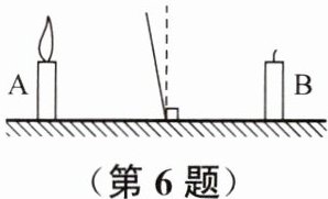 6. 如图所示,在研究平面镜成像的特点实验时,小明同学没有把薄玻璃板竖直放置。在水平桌面上,无论如何移动蜡烛B,发现(