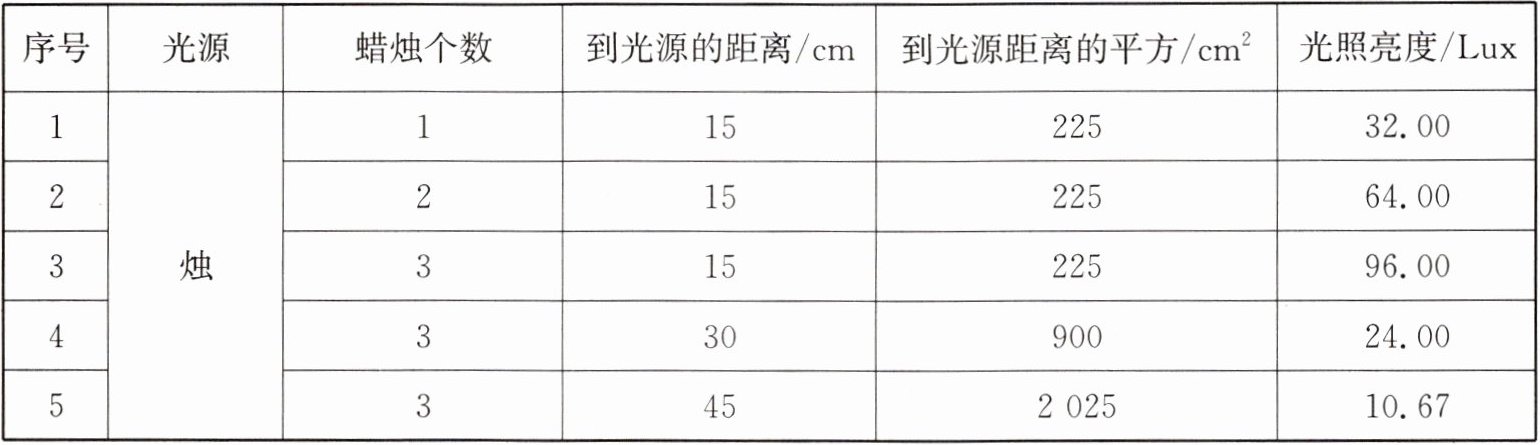 |序号|光源|蜡烛个数|到光源的距离/cm|到光源距离的平方$/cm^2$|光照亮度/Lux|