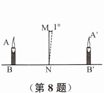 8. 如图所示,物体AB在平面镜MN前,所成的像在位置A'B'处。现将平面镜以N为中心,顺时针旋转1°,那么物体所成的像 (