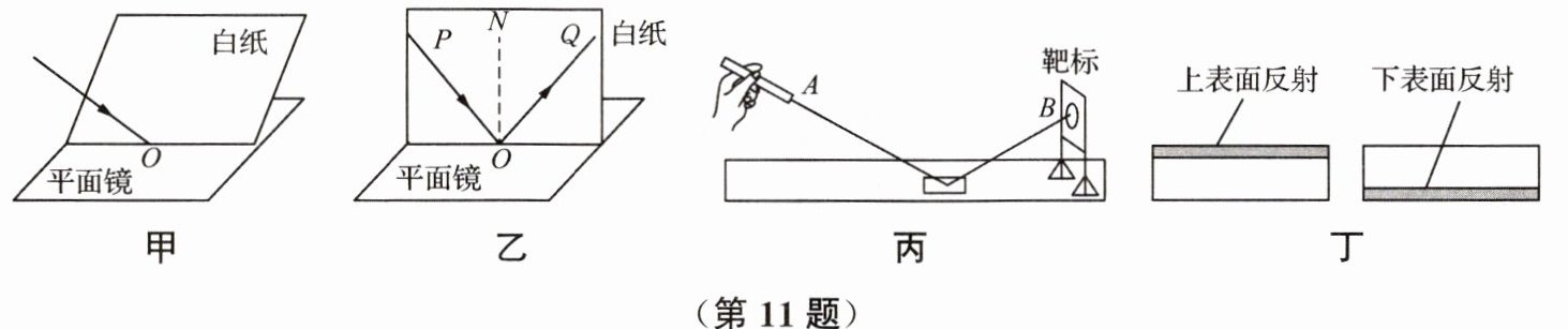 11. 在“探究光的反射定律”实验中,小明将平面镜放置在水平桌面上,如图甲所示。