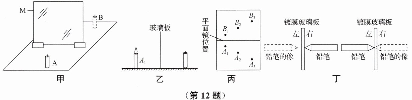 12. 用如图甲所示的装置“探究平面镜成像时,像的位置和物体的位置有什么关系”。A、B是两支外形相同的蜡烛,M是有一面镀膜的玻璃板。镀膜玻璃也称反射玻璃,是在玻璃表面涂镀一层合金或金属化合物薄膜,镀膜后既增强了对光的反射,又能保证一定的透光性。
