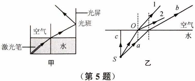 5. 小华利用图甲装置探究光的折射规律,激光笔发出的光从水中斜射入空气,在光屏(放置在空气中)上形成光斑。
