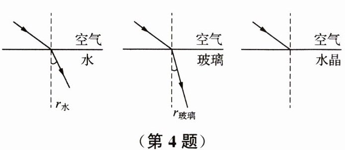 4. 如图所示,小明用一束光先后从空气斜射入水、玻璃和水晶保持入射角不变,发现水中的折射角$r_{水}大于玻璃中的折射角r_{玻璃}$。他查询资料得知光在水、水晶、玻璃中的速度关系$c_{水}>c_{水晶}>c_{玻璃}$。他猜想:入射角不变时,光在介质中速度越快,折射角越大,若他的猜想正确,则在水晶中的折射角$r_{水晶}$应满足 (