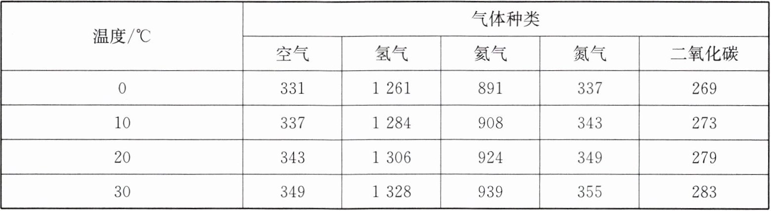 5. 下表记录了声波在不同种类的气体和温度下的速度(单位:m/s),请依据表中的相关数据回答问题。