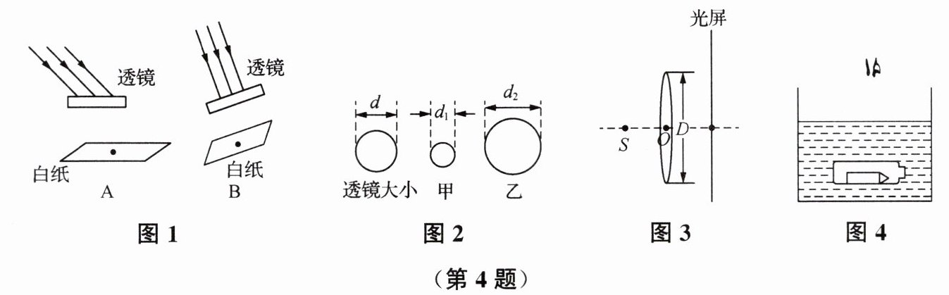 的距离即为凸透镜的焦距。(3)小明在空的透明饮料瓶(瓶身呈圆柱状)内封闭一支铅笔,将瓶子横着按入面盆里的水面下,人眼从水面上观察瓶中的铅笔(如图 4),会发现铅笔