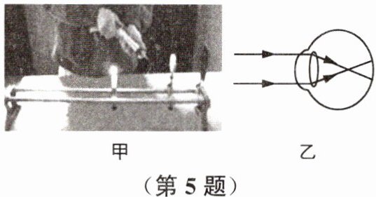 5. 小吴用弹性膜注水制作了一个水凸透镜,通过注射器注水或抽水改变透镜的厚度,如图甲所示是他用其模拟正常眼睛看物体时的装置。固定透镜,将一个F形光源放在合适的位置后,调节光屏得到清晰的像,下列说法正确的是(