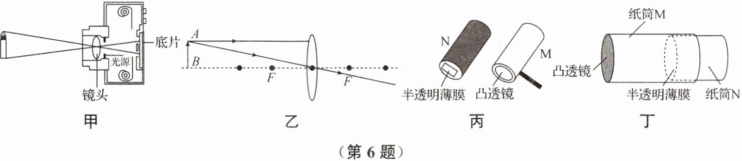 ②试用与调整在较暗的室内,把____(选填“凸透镜”或“薄膜”)对着明亮的室外,拉动纸筒N,如图丁所示,改变凸透镜和薄膜间的距离,就可以在薄膜上看到景物清晰的像。如果想使薄膜上的这个像更大一些,应将自制相机靠近景物,同时向____(选填“靠近”或“远离”)凸透镜方向移动纸筒N。